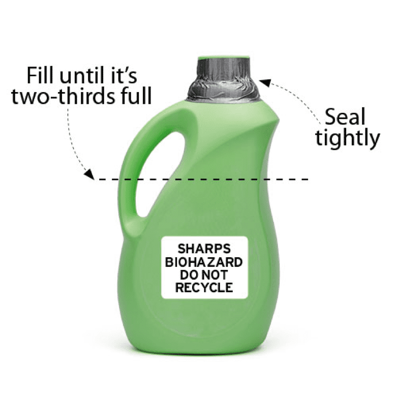 You can also use heavy plastic bottles that close properly such as the laundry container that is pictured above. It is very important that you label the container with a “USED SHARPS. DO NOT RECYCLE” sign. This will alert the person that is disposing of it how to safely handle it. When you have filled up the container, close it tightly and tape the lid on.