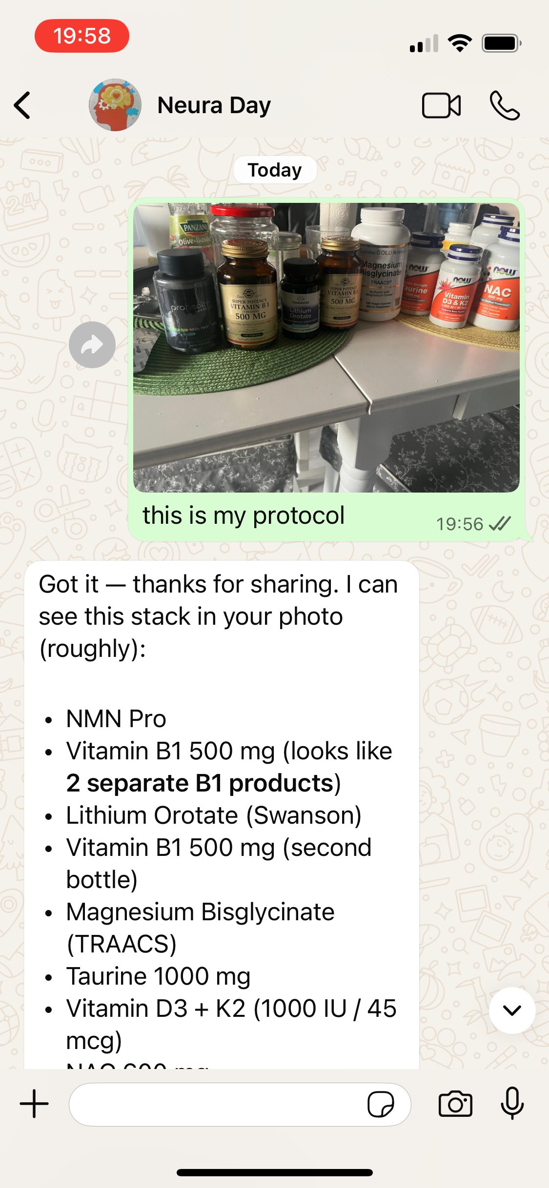 Log your sleep, symptoms, energy, mood, activity, and medication timing with simple messages. No need to open apps or fill out complicated fields.